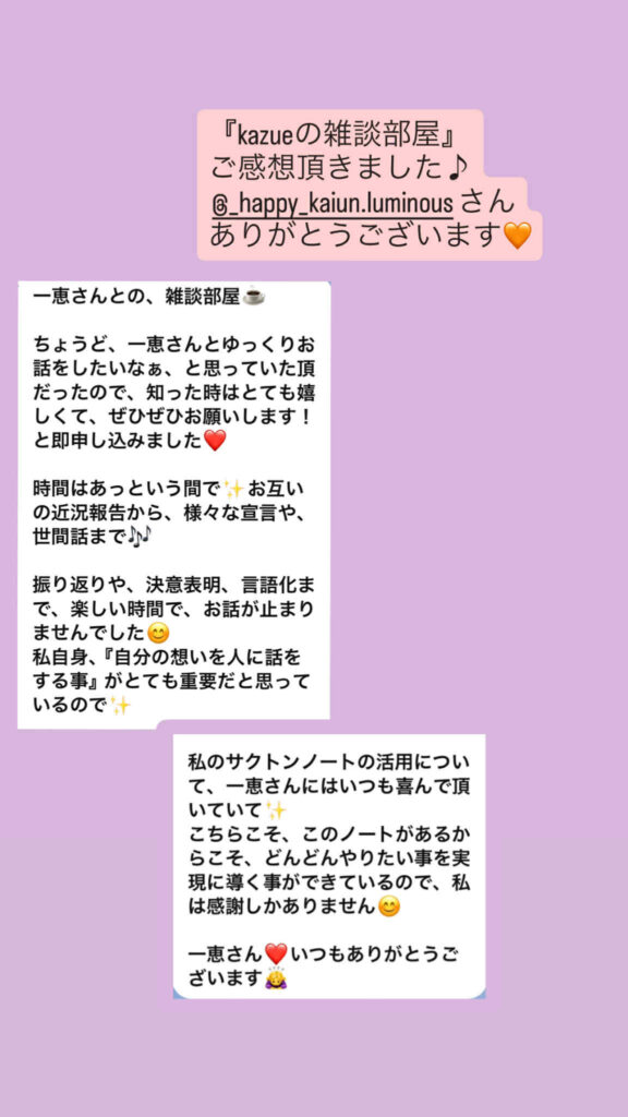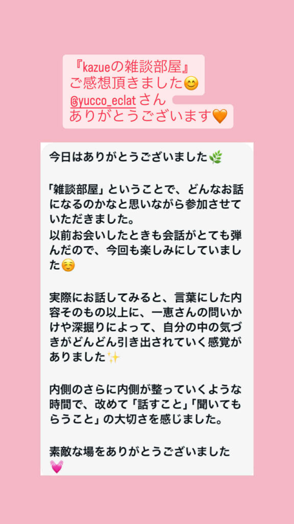 今回は新しい試みとして、私自身をもっと身近に感じていただけたらと想いを込めて、『Kazueの雑談部屋』を開催いたしました✨